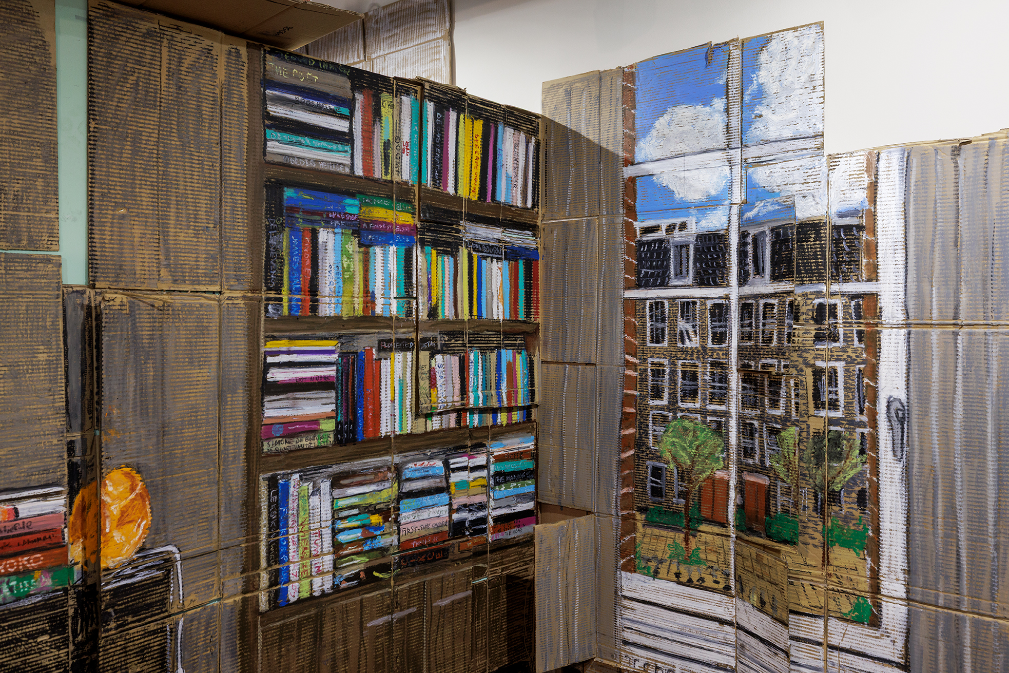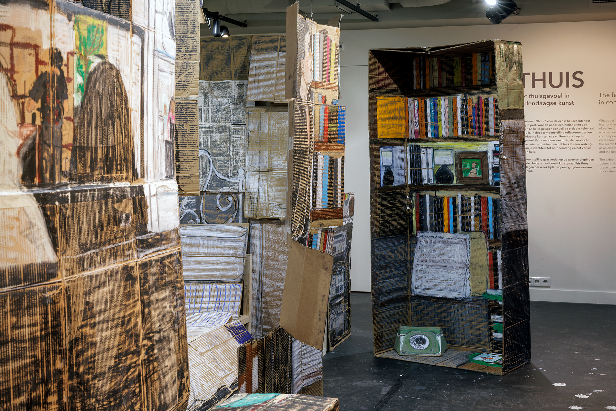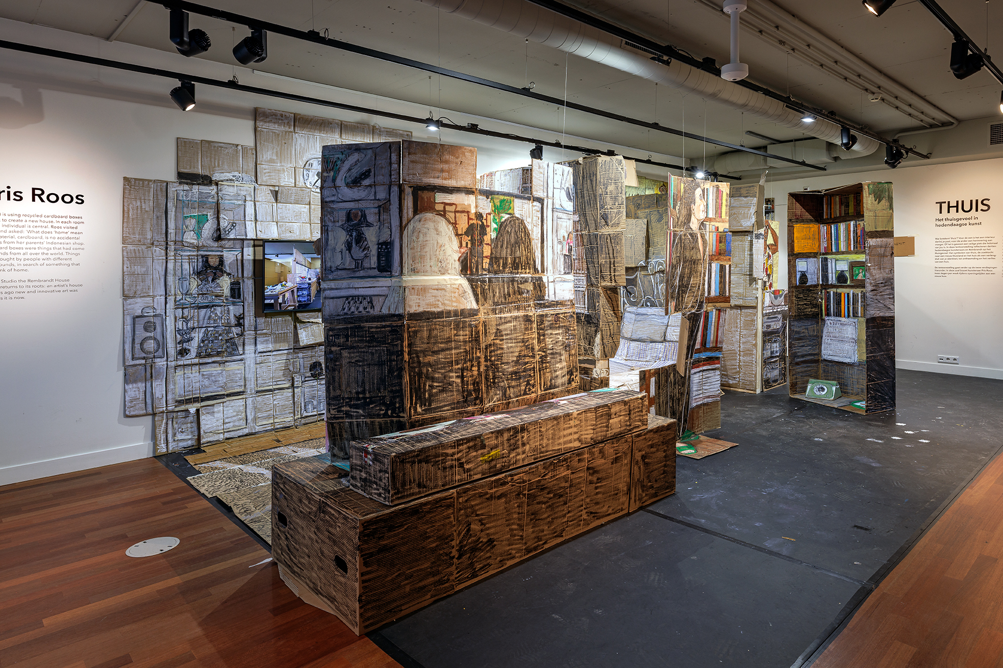 “Pris Roos is building a new 'home' in the museum. Artist Pris Roos will be creating live art in the Open Studio two days a week this fall. As part of the exhibition "THUIS. Feeling at Home in Contemporary Art," she is creating a large-scale installation: a new home made of recycled cardboard and pastels. Each room focuses on the personal story of a single individual.