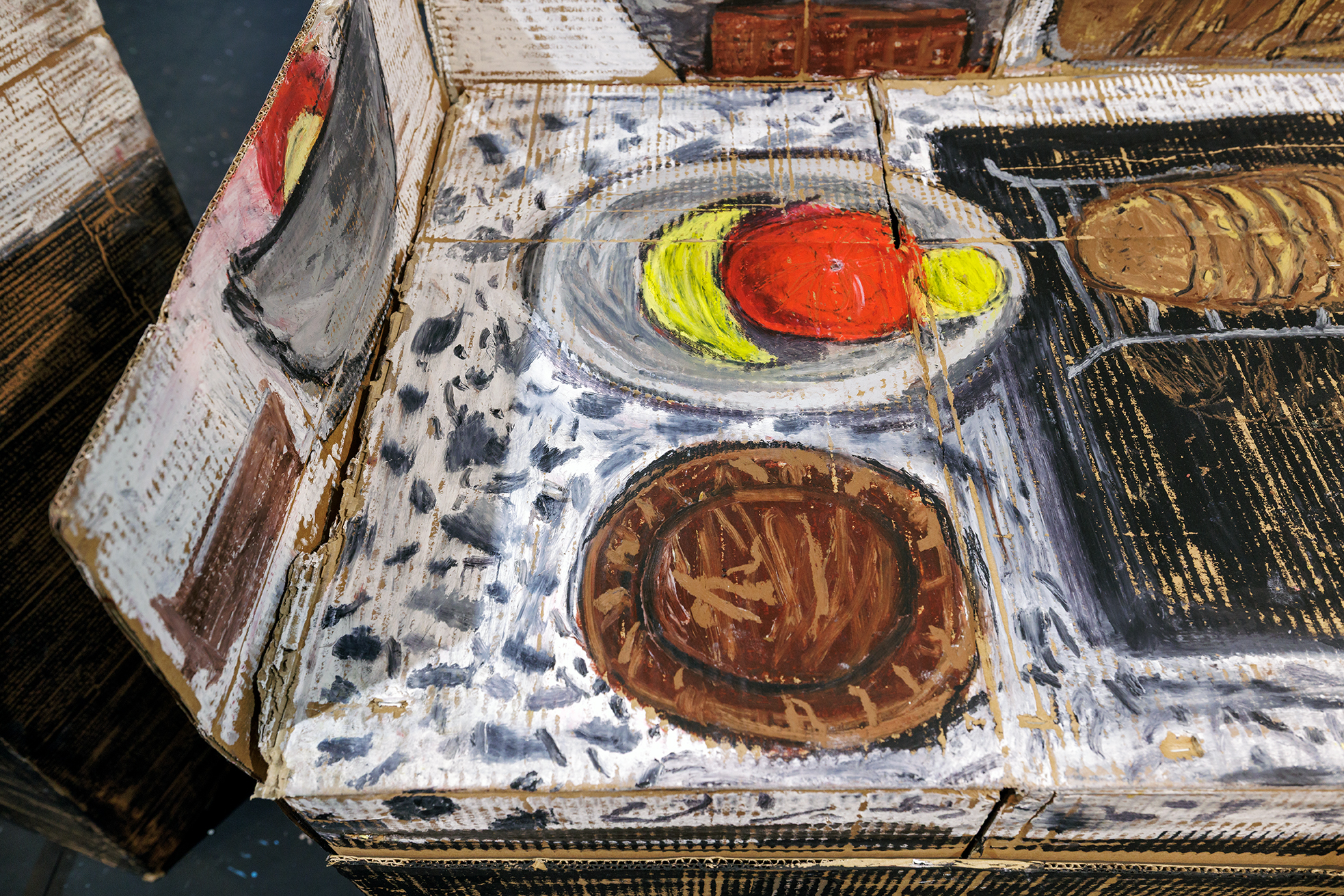 For this project, Roos visited several people at home and asked, "What does 'home' mean to you?" Based on these conversations and her impressions, she created an interior. Her material, cardboard, was no coincidence: it originated from her parents' shop. This cardboard contains items from all over the world, often purchased by people from diverse cultural backgrounds, searching for something that reminds them of home. “ (website: Rembrandthuis)